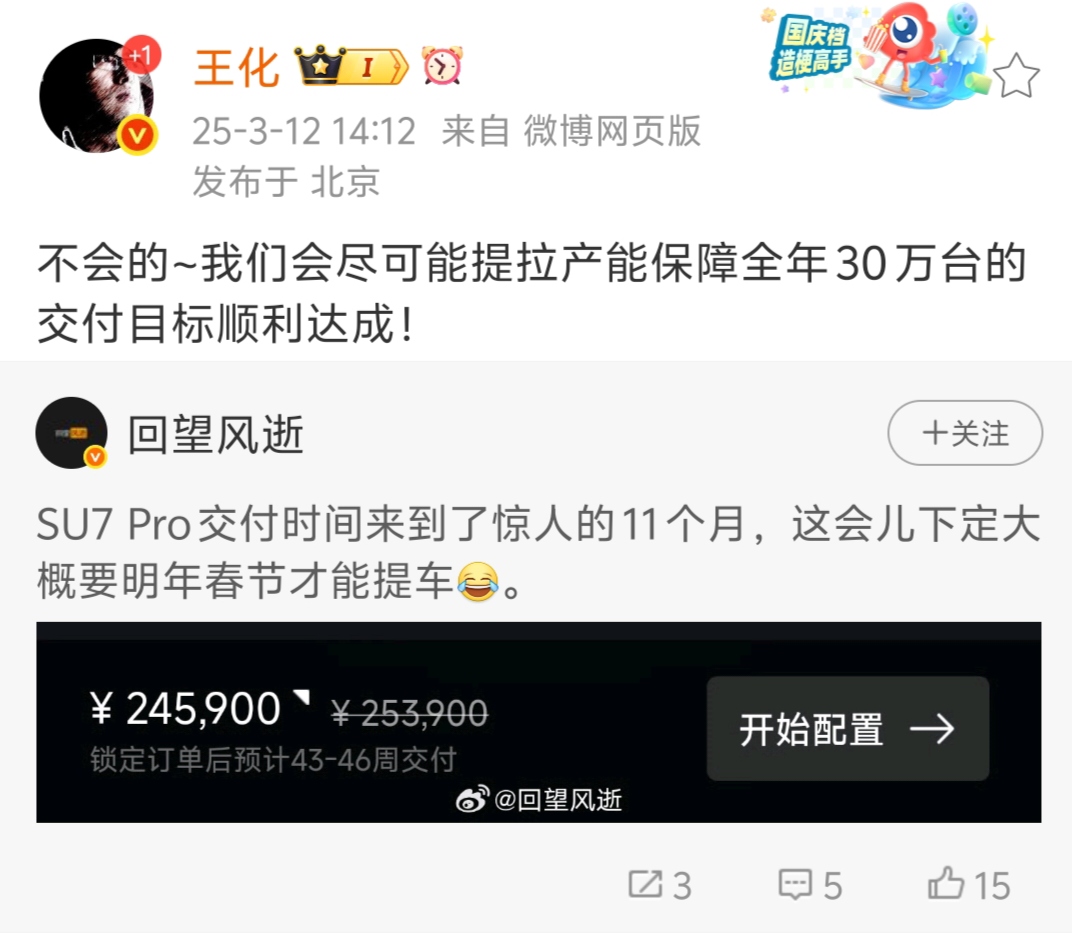 今日,有用户在微博发文表示,“SU7 Pro交付时间来到了惊人的11个月,这会儿下定大概要明年春节才能提车。”对此,小米集团公关部总经理王化转发了该微博,并回复称,“不会的,我们会尽可能提拉产能保障全年 30 万台的交付目标顺利达成!”(新浪科技)